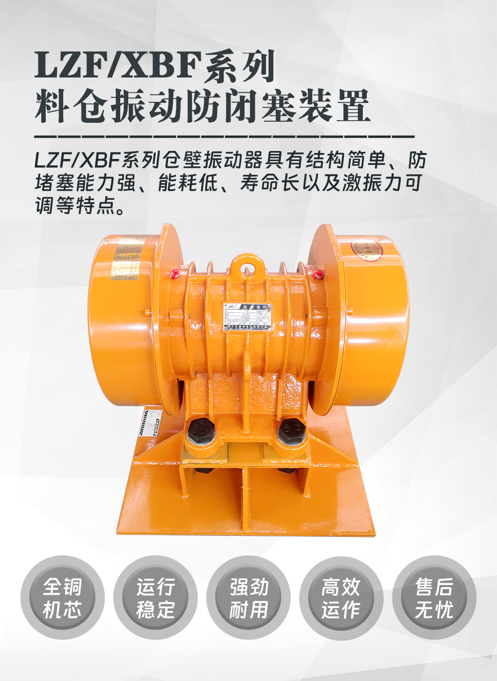 LZF系列料倉(cāng)振動(dòng)防閉塞振動(dòng)器(簡(jiǎn)稱(chēng)振動(dòng)器)是一種利用振動(dòng)電機(jī)產(chǎn)生高頻振動(dòng)的裝置,主要用于防止和消除料倉(cāng)、料斗或管狀通道內(nèi)的物料起拱、管狀通道形成、內(nèi)粘倉(cāng)等堵塞現(xiàn)象。通過(guò)振動(dòng),振動(dòng)器能夠有效地打破物料之間的靜摩擦力和凝聚力,保證物料能夠順暢流動(dòng),提高物料輸送的自動(dòng)化程度.