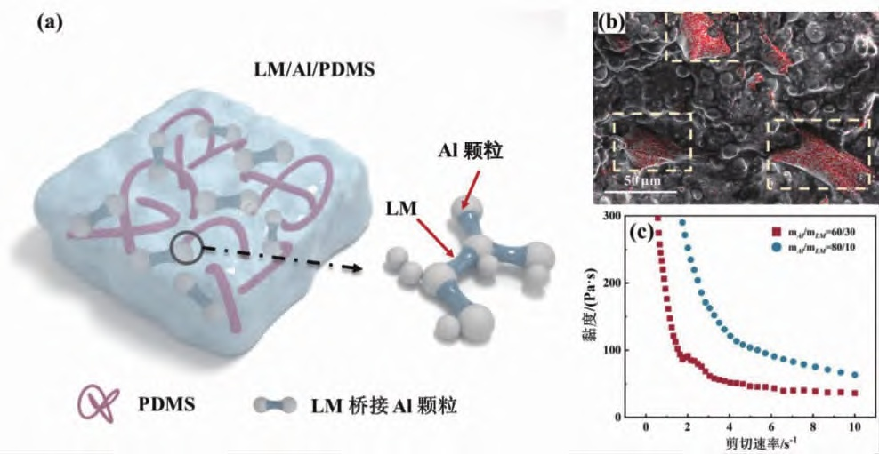 龐云嵩團隊通過向聚二甲基硅氧烷/鋁體系中引入液態金屬,鎵基液態金屬以“液橋”的形式在球形鋁與球形鋁之間架起利于聲子傳熱的通道,從而降低界面熱阻,提高熱界面材料的導熱性能;同時,避免了高填料含量導致的柔順性下降問題。