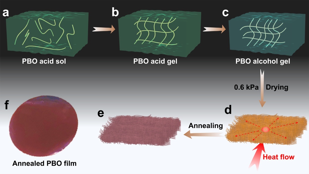 在提升聚合物自身導熱性能方面,趙寧課題組通過剝離聚對苯撐苯并二噁唑(PBO)纖維獲得納米纖維分散液,結合溶膠-凝膠-薄膜轉變與熱退火工藝,制備出高度取向的PBO薄膜,其面內熱導率達36.7 W/m·K,比常規聚合物(<0.5 W/m·K)提高兩個數量級,同時保持優異的電絕緣性與阻燃性。這種本征高導熱聚合物的開發,為高溫、復雜環境下的熱管理提供了新選擇。