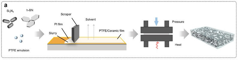 吳唯教授團隊通過原位還原法在氮化硼(BN)片層表面負載納米銅球,形成BN Cu雜化填料。二維BN提供平面導熱路徑,而表面凸起的納米銅球增強填料-基體接觸,減少聲子散射,最終使聚合物導熱系數提升500%。另一項研究中,四川大學團隊設計了一個由二維六方氮化硼(h-BN)和Si3N4組成的多組分混合填料網絡,解決了在聚四氟乙烯(PTFE)復合材料中實現高導熱性、低介電損耗和強粘附性的挑戰。這些多尺度結構設計,實現了導熱路徑的立體化與高效化。