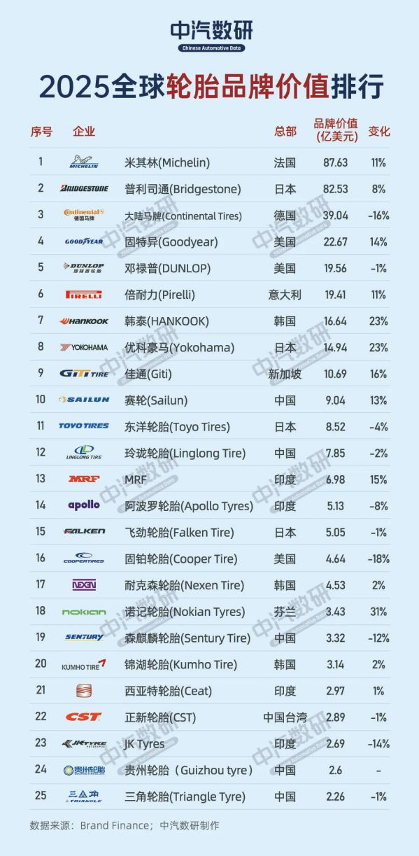 在榜單的頭部陣營(yíng)中,傳統(tǒng)輪胎巨頭依然占據(jù)主導(dǎo)地位。法國(guó)的米其林以87.63億美元的品牌價(jià)值連續(xù)八年蟬聯(lián)榜首,同比增長(zhǎng)11.3%;而日本的普利司通和德國(guó)的大陸馬牌則緊隨其后。