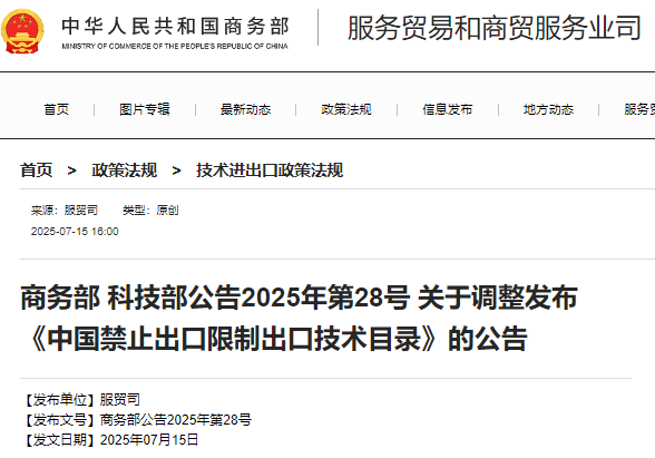 7月15日,商務部會同科技部調整發布《中國禁止出口限制出口技術目錄》(簡稱:《目錄》),自公布之日起實施。
