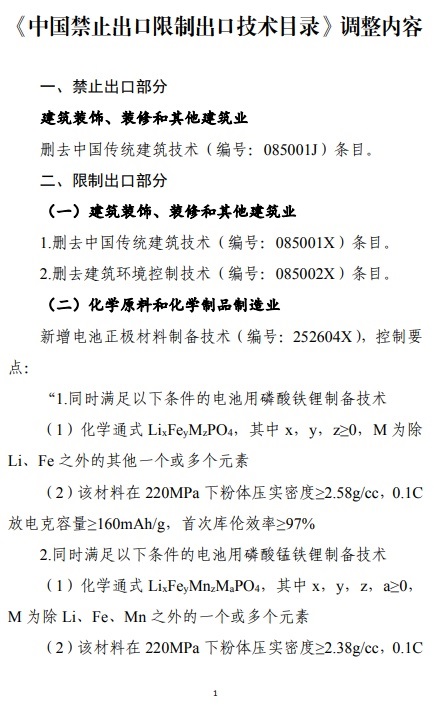 二是新增1項限制類技術條目,即電池正極材料制備技術,包括:新增電池用磷酸鐵鋰制備技術、電池用磷酸錳鐵鋰制備技術、磷酸鹽正極原材料制備技術等3條控制要點。電池正極材料制備技術在敏感領域正越來越多地得到應用,將相關技術納入《目錄》限制類,有利于更好統籌發展和安全,促進相關技術的安全、可持續的應用和發展。