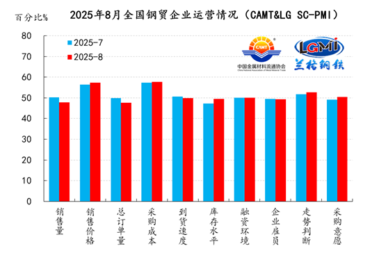 中國金屬材料流通協(xié)會、蘭格鋼鐵網(wǎng)聯(lián)合發(fā)布的2025年8月份中金協(xié)&蘭格鋼鐵網(wǎng)·鋼鐵流通PMI指數(shù)為49.8%,與上月持平,維持在收縮區(qū)間內(nèi)。從分類指數(shù)看,構(gòu)成中金協(xié)&蘭格鋼鐵網(wǎng)·鋼鐵流通PMI的10個分類指數(shù)5升5降,其中銷售價格、采購成本、庫存水平、走勢判斷和采購意愿5項指數(shù)上升,而銷售量、總訂單量、到貨速度、融資環(huán)境和企業(yè)雇員5項指數(shù)下降。