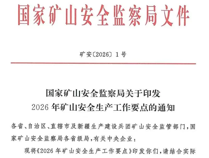 近日,國家礦山安全監察局印發《2026年礦山安全生產工作要點》(礦安〔2026〕1號),以28條硬措施筑牢礦山安全防線。工作要點將托管責任界定、AI技術應用、中小礦山升級等納入核心任務,圍繞事前預防轉型、本質安全提升主線,對非煤礦山安全生產作出全面部署,給砂石、水泥等非煤礦山企業劃定了全年安全工作的“硬標尺”。