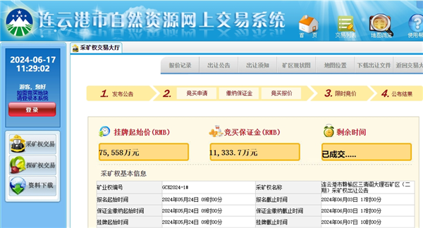 該礦位于連云港市贛榆區班莊鎮,礦區面積0.2884平方千米,擬出讓年限22年(含基建期1年),主要開采礦種為飾面用大理石,產品主要為飾面用大理石荒料、建筑用碎石。此外,采礦權出讓收益分12期繳納,首期繳納采礦權出讓收益成交金額的15%,余下85%分11年繳清。